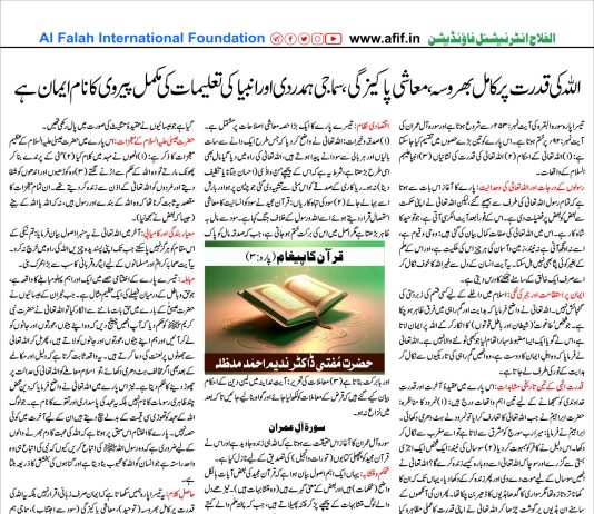 اللہ کی قدرت پر کامل بھروسہ ، معاشی پاکیزگی، سماجی ہمدردی اور انبیا کی تعلیمات کی مکمل پیروی کا نام ایمان ہے