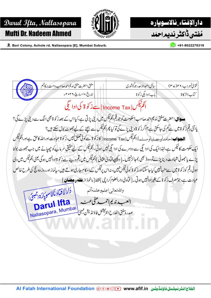 الجواب:حامداً و مصلیاً و مسلماً:انکم ٹیکس [Income Tax] کا زکوٰۃ سے کوئی تعلق نہیں، زکوٰۃ عبادت اور اللہ کا حق ہے اور انکم ٹیکس ایک حکومت کا ٹیکس ہے، لہٰذا ایک کی ادایگی سے دوسرے کی ادایگی نہیں ہوتی، انکم ٹیکس کے لیے حقیقی سرمایے کو چھپانے میں جب جھوٹ بولنا پڑے یا جھوٹی شہادت دینا پڑے تو وہ (بھی) جائز نہیں۔[دیکھیے فتاویٰ عثمانی] انکم ٹیکس میں رقم دینے سے زکوٰۃ ادا نہیں ہوگی یعنی انکم ٹیکس میں دی ہوئی رقم کو زکوٰۃ میں سے منہا نہیں کیا جا سکتا اور زکوٰۃ کوئی ٹیکس نہیں، نہ اس پر ٹیکس کے احکام جاری ہوتے ہیں، یہ نماز اور روزہ و حج کی طرح خالص عبادت ہے، جو مصرفِ زکوٰۃ کے بغیر ادا نہیں ہوتی۔ [فتاویٰ دارالعلوم کراچی]فقط [ماخوذ از فقہِ رمضان]