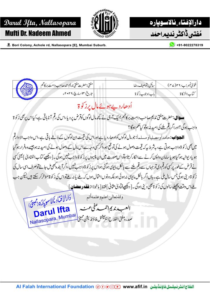 الجواب:حامداً و مصلیاً و مسلماً:جو مال لوگوں کو ادھار دیا ہے اور اس کی قیمت ان لوگوں کے ذمّے باقی ہے ، اس واجب الادا رقم میں بھی زکوٰۃ واجب ہوتی ہے، بہ شرط یہ کہ قیمت وصول ہونے کی توقع ہو، اگر کسی وجہ سے اس مال کے وصول ہونے کی امید نہ ہو جیسے وہ فرار ہو گیا ہو یا دیوالیہ ہو گیا ہو یا سامان واپس کرنے سے انکار کرتا ہو تو اس صورت میں ان پیسوں پر زکوٰۃ واجب نہیں ہوگی۔[دیکھیے کتاب الفتاویٰ] یعنی کسی نے قرض کے طور پر کسی کو رقم دی تو جہاں سے رقم ملنے سے بالکل مایوسی ہو گئی ہو اس پر زکوٰۃ واجب نہیں، اگر آیندہ کبھی مل جائے تو صرف اسی سال کی زکوٰۃ دینی ہوگی جس سال ملی ہے۔ ہاں اگر بالکل مایوسی نہ ہوئی ہو بلکہ دونوں احتمال ہوں کہ ملے یا نہ ملے تو اس کی زکوٰۃ مؤخر کر سکتے ہیں، لیکن جب ملے اس وقت پچھلے سالوں کی زکوٰۃ بھی دینی ہوگی۔[دیکھیے فتاویٰ عثمانی]فقط [ماخوذ از فقہِ رمضان]