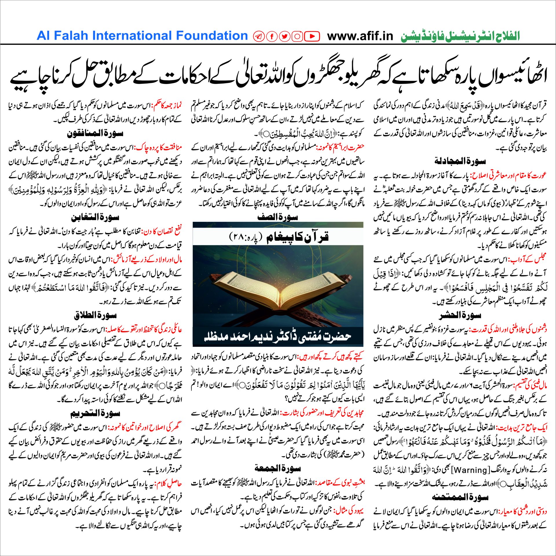 اٹھائیسواں پارہ سکھاتا ہے کہ گھریلو جھگڑوں کو اللہ تعالیٰ کے احکامات کے مطابق حل کرنا چاہیے