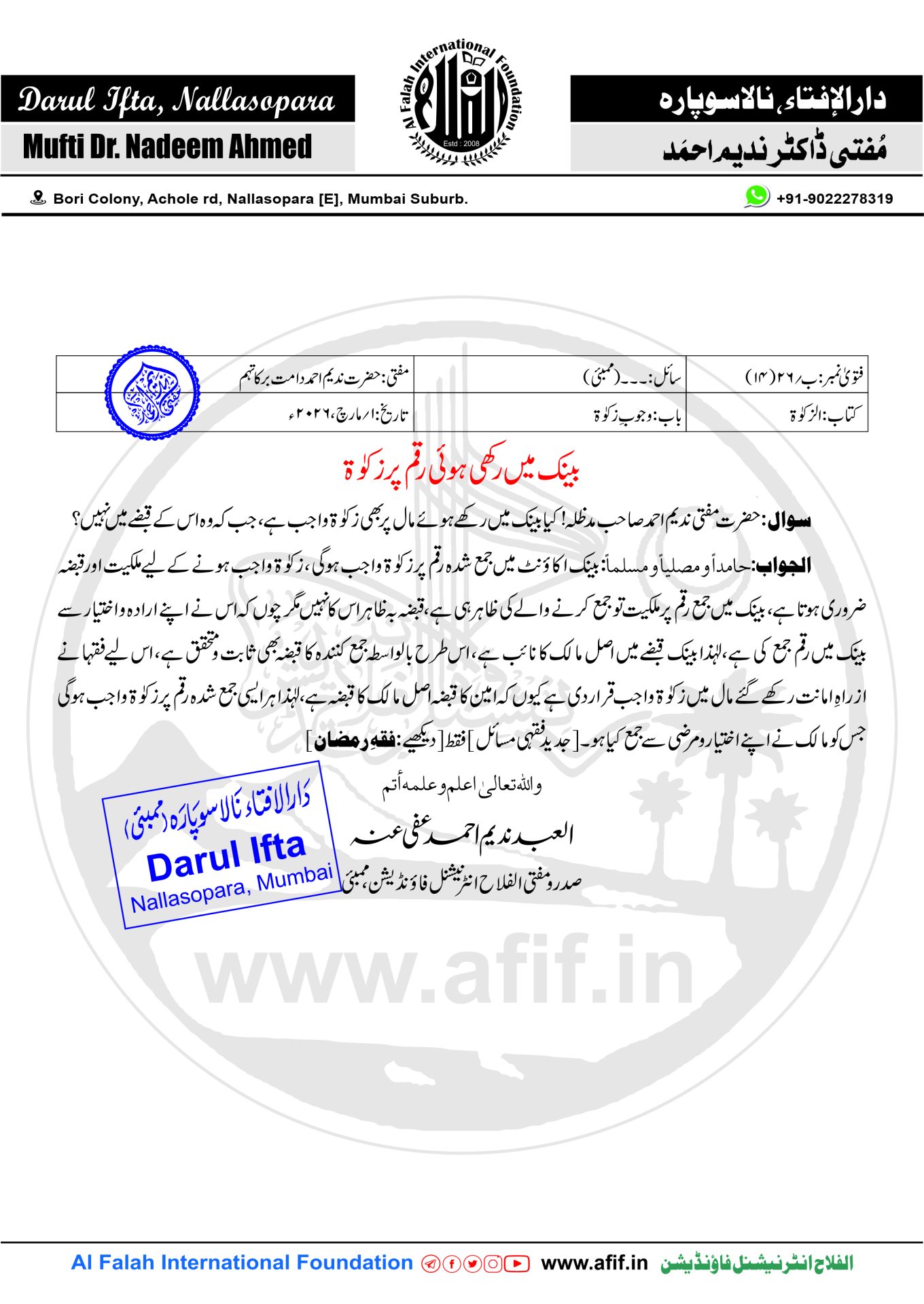 سوال:حضرت مفتی ندیم احمد صاحب مدظلہ! کیا بینک میں رکھے ہوئے مال پر بھی زکوٰۃ واجب ہے، جب کہ وہ اس کے قبضے میں نہیں؟