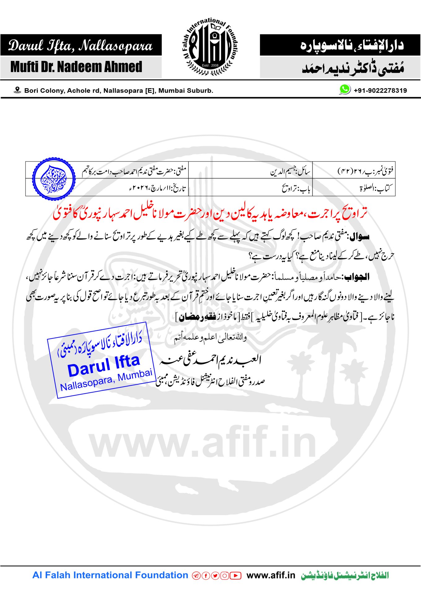 تراویح پر اجرت، معاوضہ یا ہدیہ کا لین دین اور حضرت مولانا خلیل احمد سہارنپوریؒ کا فتویٰ