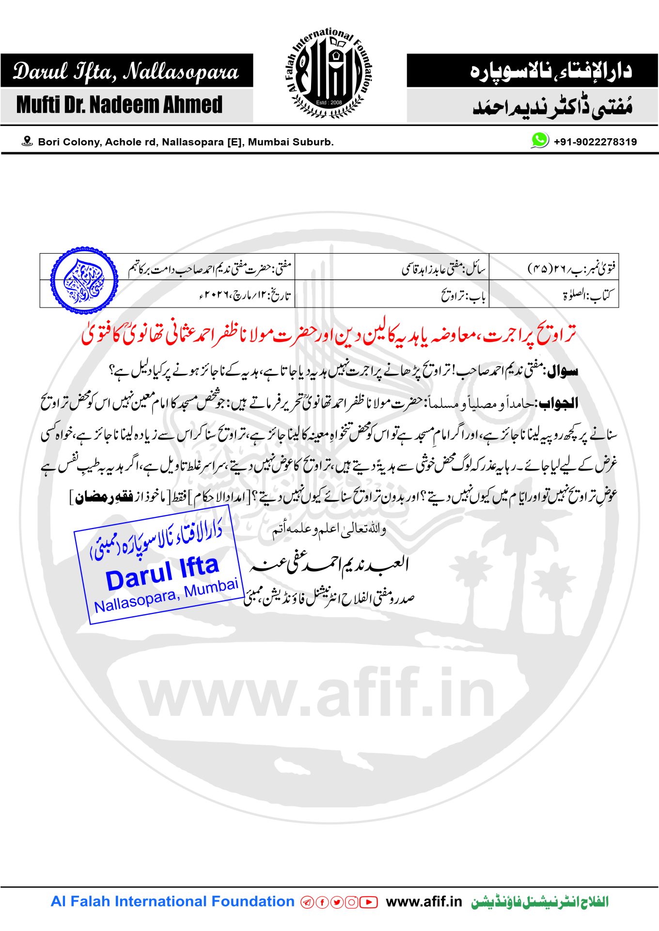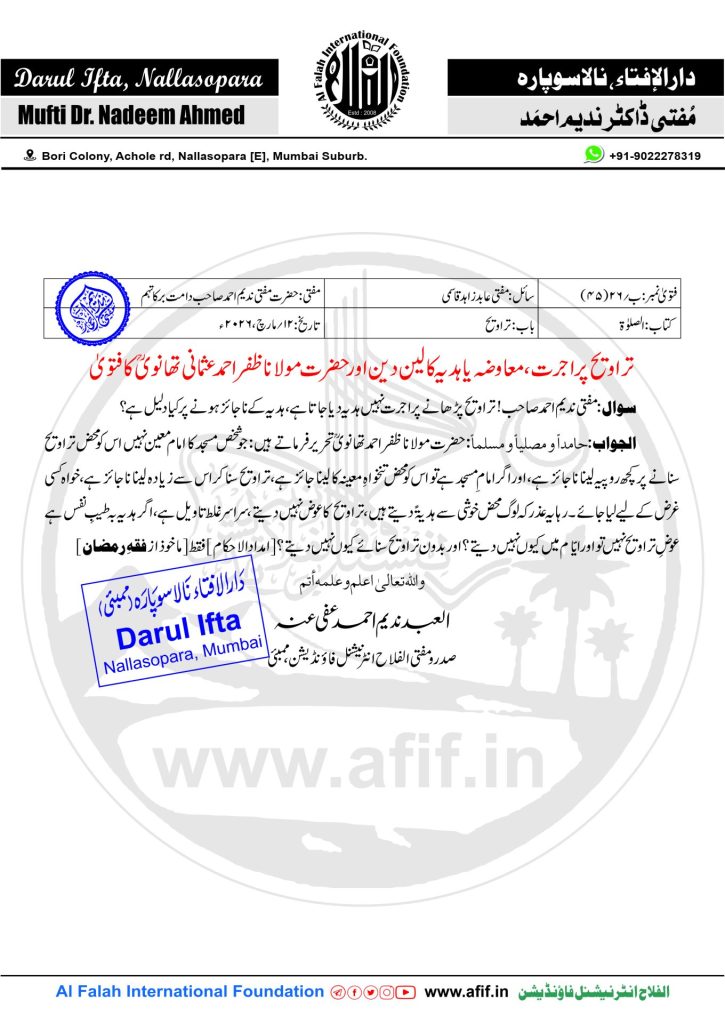سوال:مفتی ندیم احمد صاحب! تراویح پڑھانے پر اجرت نہیں ہدیہ دیا جاتا ہے، ہدیہ کے ناجائز ہونے پر کیا دلیل ہے؟