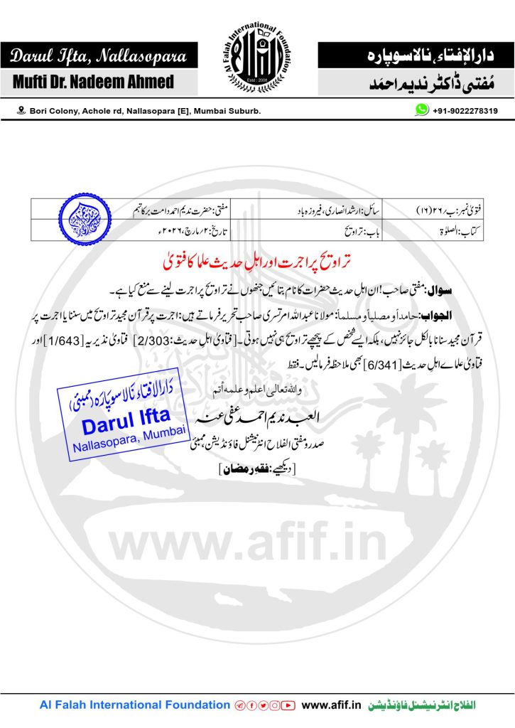 سوال:مفتی صاحب! ان اہلِ حدیث حضرات کا نام بتائیں جنھوں نے تراویح پر اجرت لینے سے منع کیا ہے۔