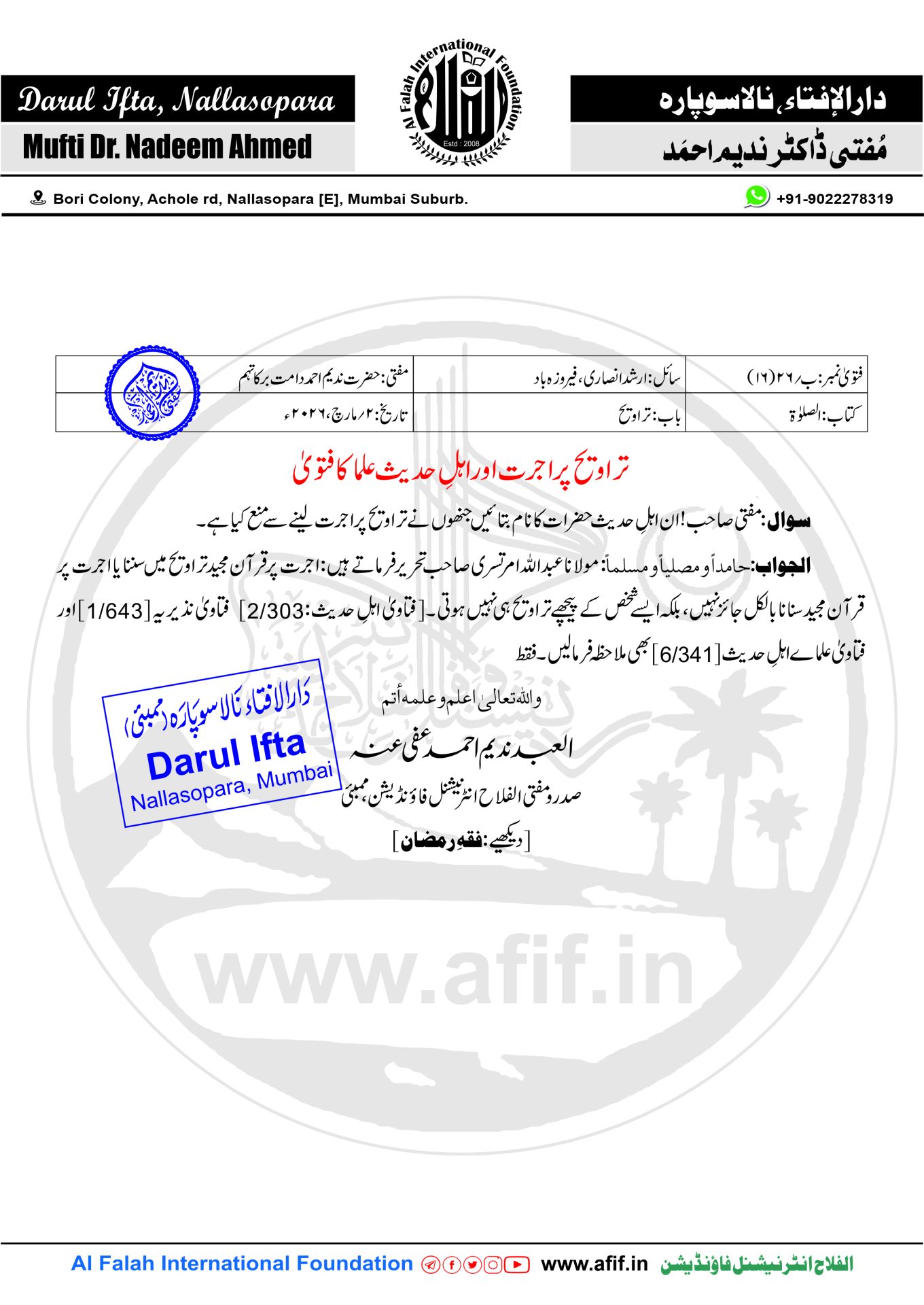 سوال:مفتی صاحب! ان اہلِ حدیث حضرات کا نام بتائیں جنھوں نے تراویح پر اجرت لینے سے منع کیا ہے۔