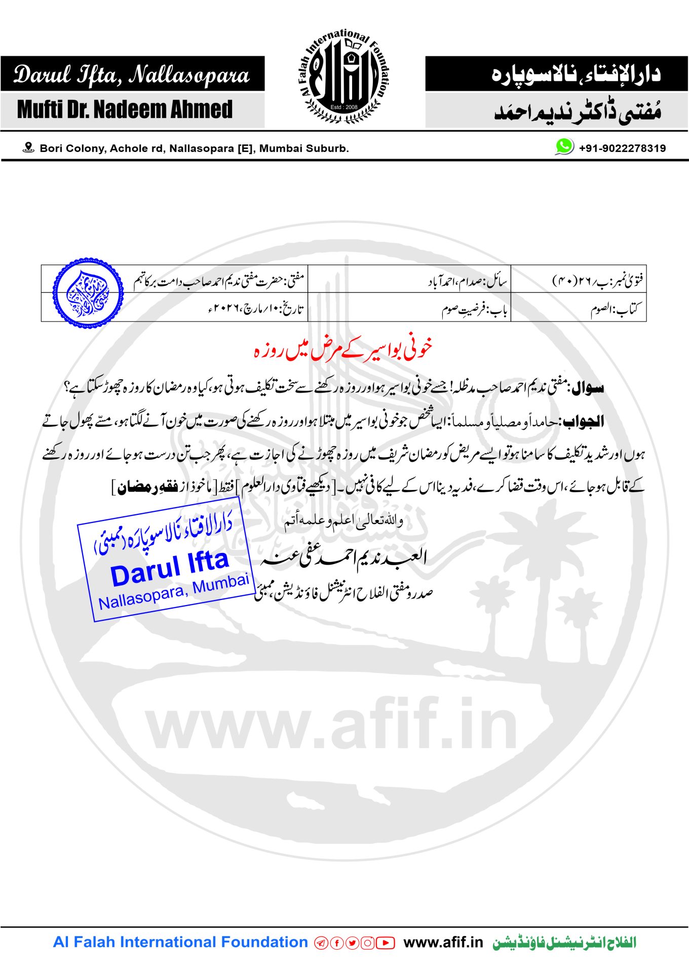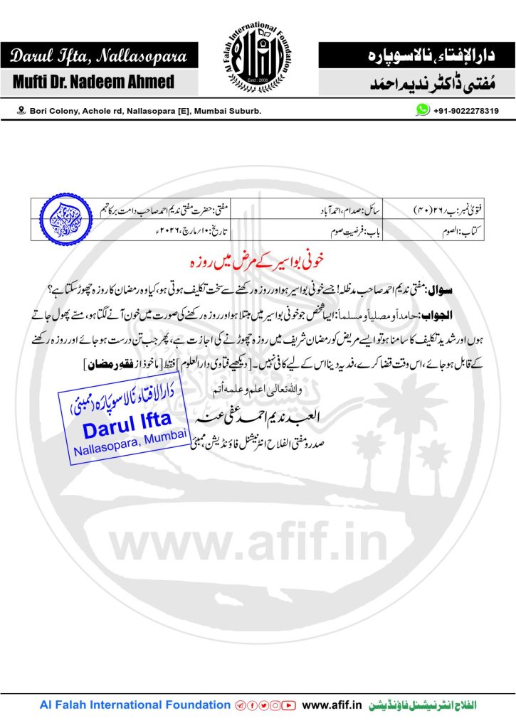 سوال:مفتی ندیم احمد صاحب مدظلہ! جسے خونی بواسیر ہو اور روزہ رکھنے سے سخت تکلیف ہوتی ہو، کیا وہ رمضان کا روزہ چھوڑ سکتا ہے؟