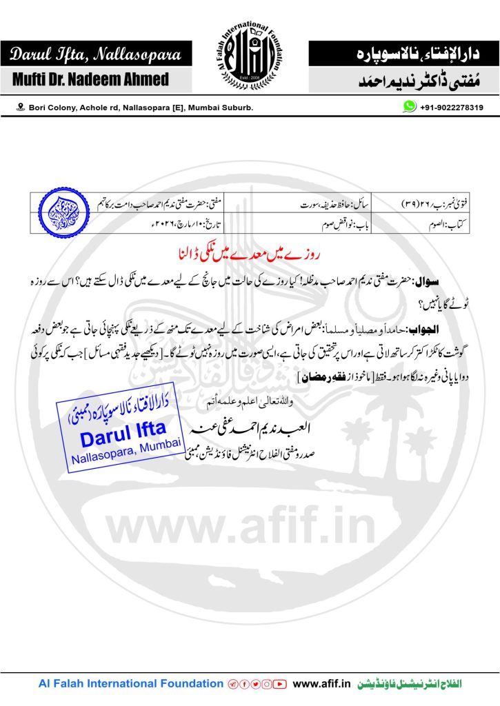 سوال:حضرت مفتی ندیم احمد صاحب مدظلہ! کیا روزے کی حالت میں جانچ کے لیے معدے میں نلکی ڈال سکتے ہیں؟ اس سے روزہ ٹوٹےگا یا نہیں؟