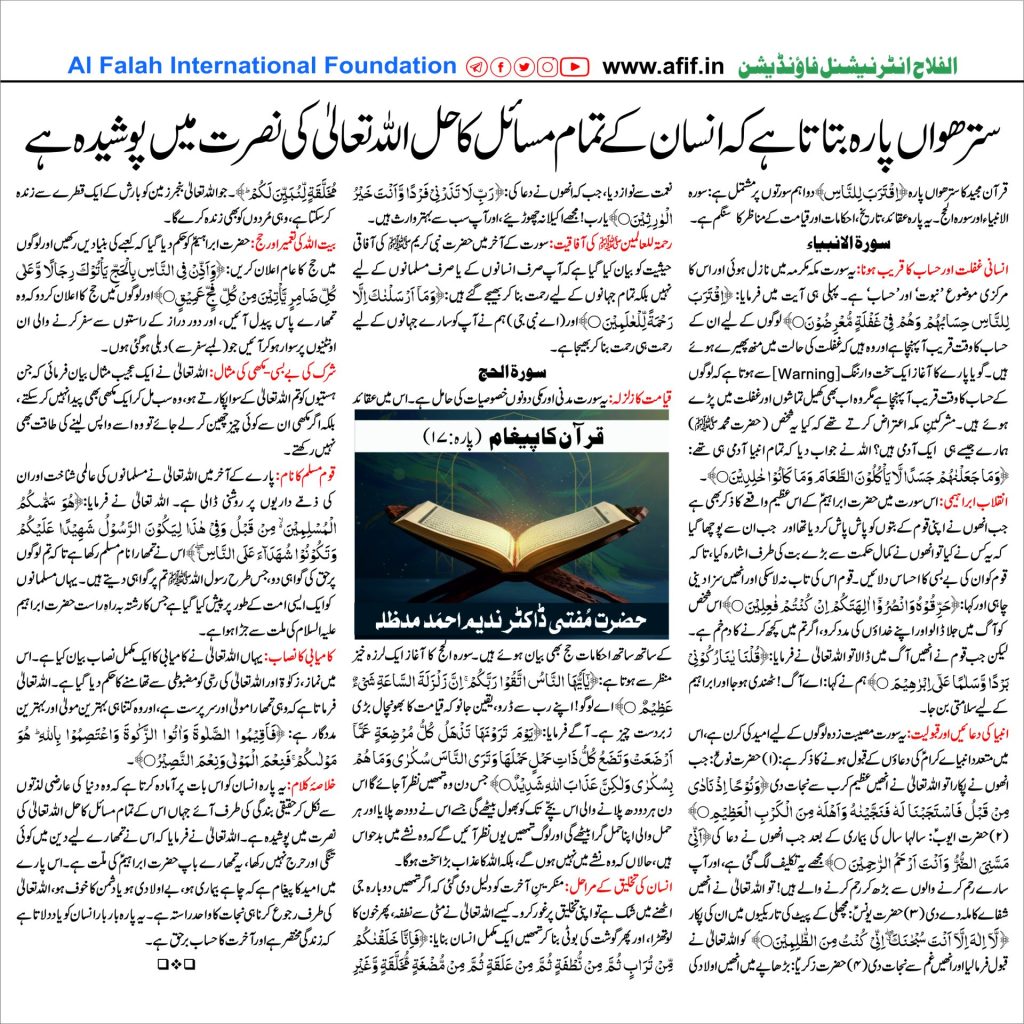 خلاصۂ کلام:یہ پارہ انسان کو اس بات پر آمادہ کرتا ہے کہ وہ دنیا کی عارضی لذتوں سے نکل کر حقیقی بندگی کی طرف آئے جہاں اس کے تمام مسائل کا حل اللہ تعالیٰ کی نصرت میں پوشیدہ ہے۔ اللہ تعالیٰ نے فرمایا کہ اس نے تمھارے لیے دین میں کوئی تنگی اور حرج نہیں رکھا، یہ تمھارے باپ حضرت ابراہیمؑ کی ملّت ہے۔اس پارے میں امید کا پیغام ہے کہ چاہے بیماری ہو، بے اولادی ہو یا دشمن کا خوف ہو، اللہ تعالیٰ کی طرف رجوع کرنا ہی نجات کا واحد راستہ ہے۔یہ پارہ بار بار انسان کو یاد دلاتا ہے کہ زندگی مختصر ہے اور آخرت کا حساب برحق ہے۔