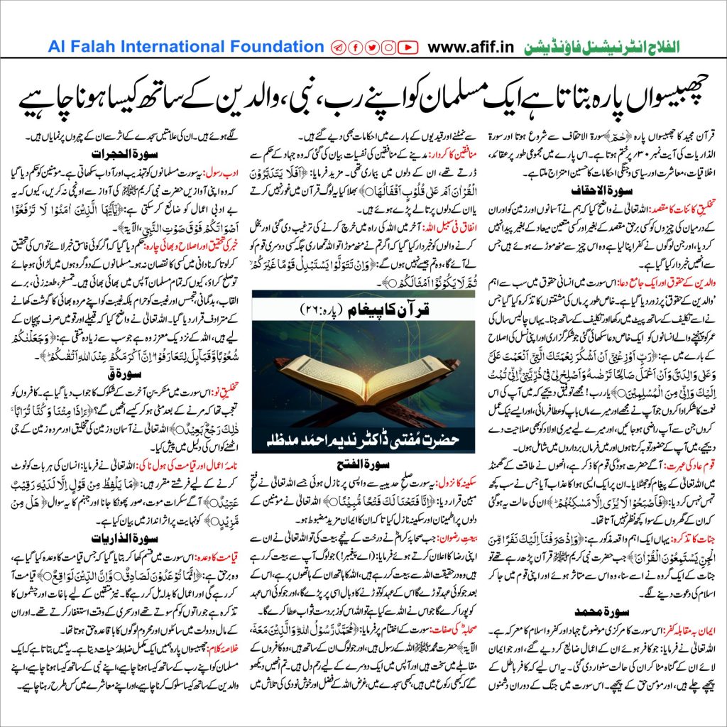 چھبیسواں پارہ بتاتا ہے کہ ایک مسلمان کو اپنے رب،نبی ،والدین کے ساتھ کیسا ہونا چاہیے