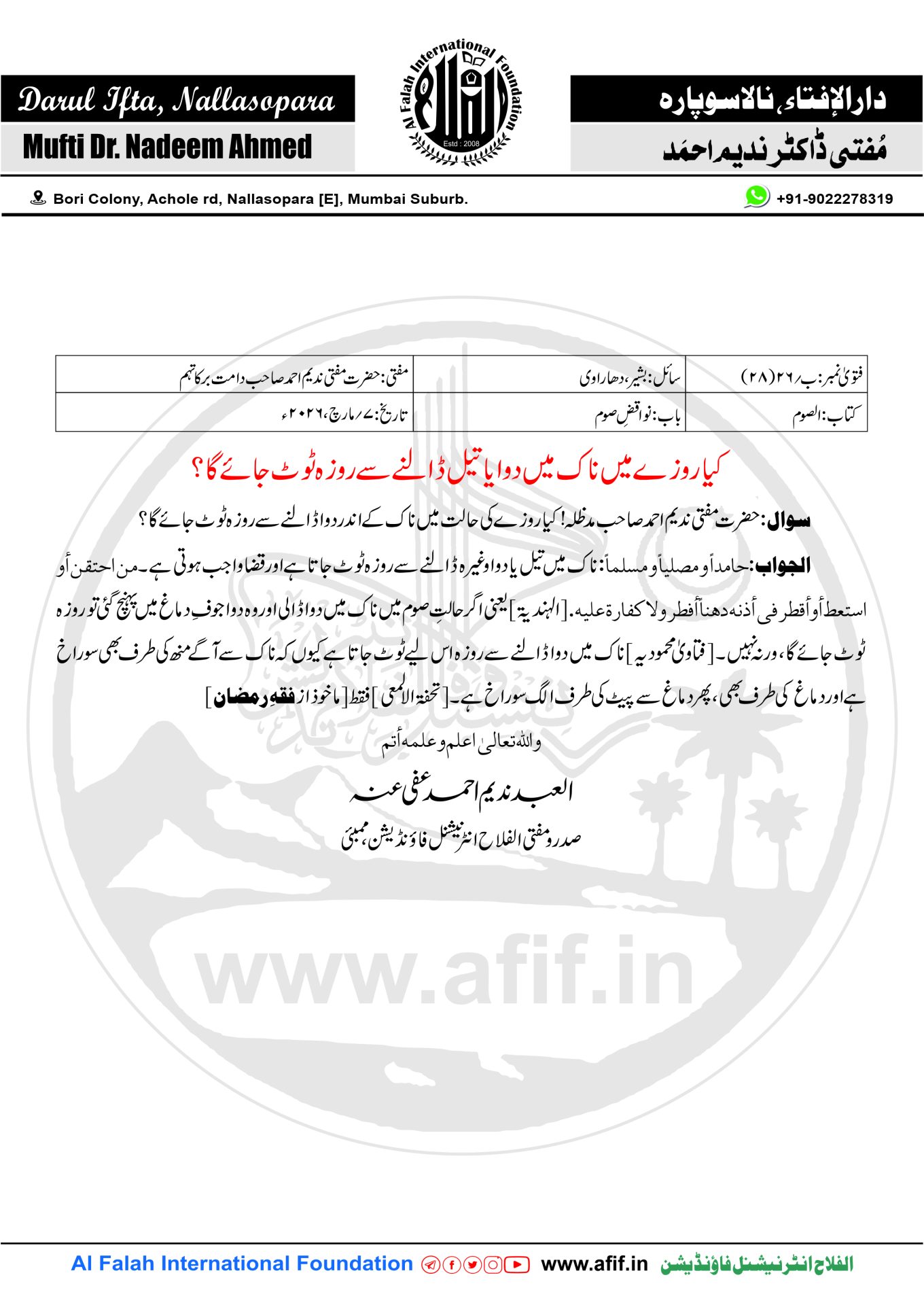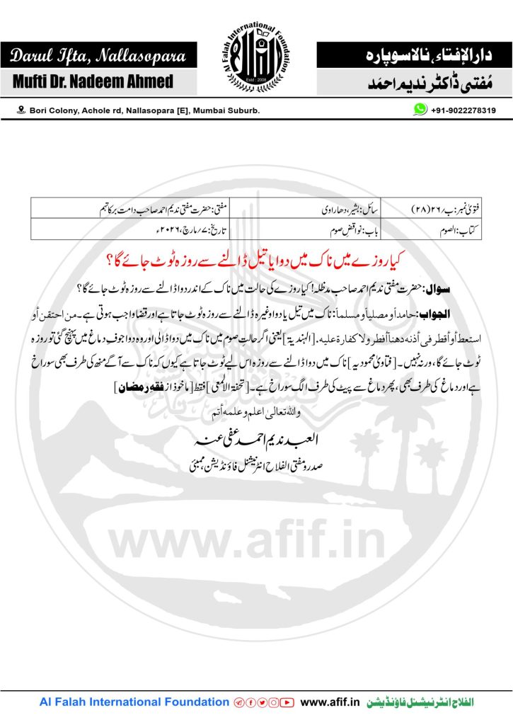 سوال:حضرت مفتی ندیم احمد صاحب مدظلہ! کیا روزے کی حالت میں ناک کے اندر دوا ڈالنے سے روزہ ٹوٹ جائےگا؟