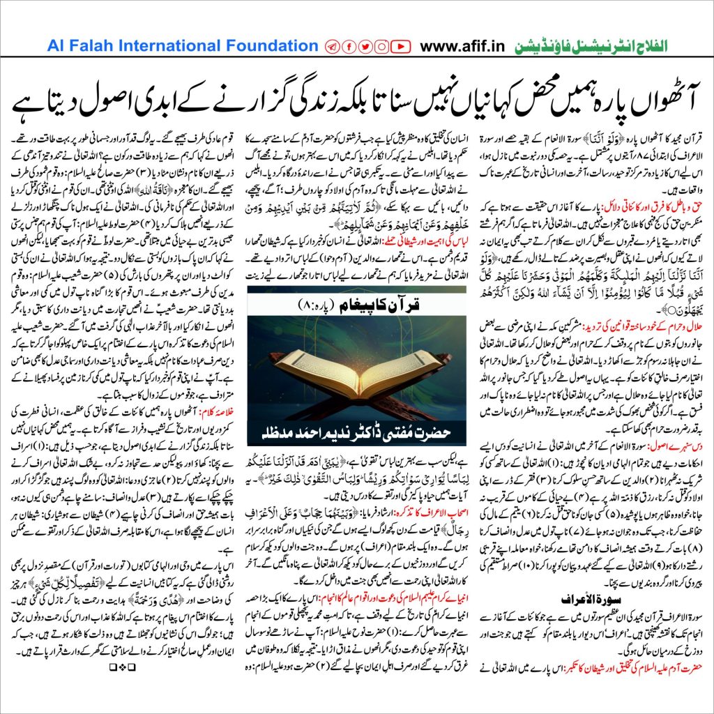 خلاصۂ کلام: آٹھواں پارہ ہمیں کائنات کے خالق کی عظمت، انسانی فطرت کی کمزوریوں اور تاریخ کے نشیب و فراز سے آگاہ کرتا ہے۔یہ ہمیں محض کہانیاں نہیں سناتا بلکہ زندگی گزارنے کے ابدی اصول دیتا ہے، جو حسبِ ذیل ہیں: (۱) اسراف سے بچنا: کھاؤ اور پیو لیکن حد سے تجاوز نہ کرو، بےشک اللہ تعالیٰ اسراف کرنے والوں کو پسند نہیں کرتا (۲)عاجزی و دعا: اللہ تعالیٰ کو وہ لوگ پسند ہیں جو گڑگڑا کر اور چپکے چپکے اسے پکارتے ہیں (۳) عدل و انصاف: سامنے چاہے دشمن ہی کیوں نہ ہو، بات ہمیشہ حق اور انصاف کی کرنی چاہیے (۴) شیطان سے ہوشیاری: شیطان ہر انسان کے پیچھے لگا ہوا ہے، اس کا مقابلہ صرف اللہ تعالیٰ کے ذکر اور تقوے سے ممکن ہے۔