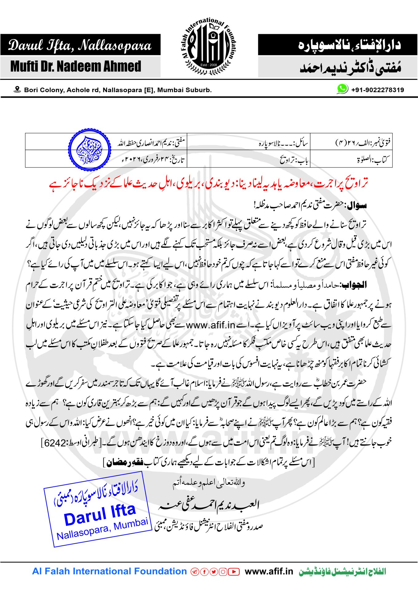 تراویح پر اجرت، معاوضہ یا ہدیہ لینا دینا: دیوبندی، بریلوی، اہلِ حدیث علما کے نزدیک ناجائز ہے