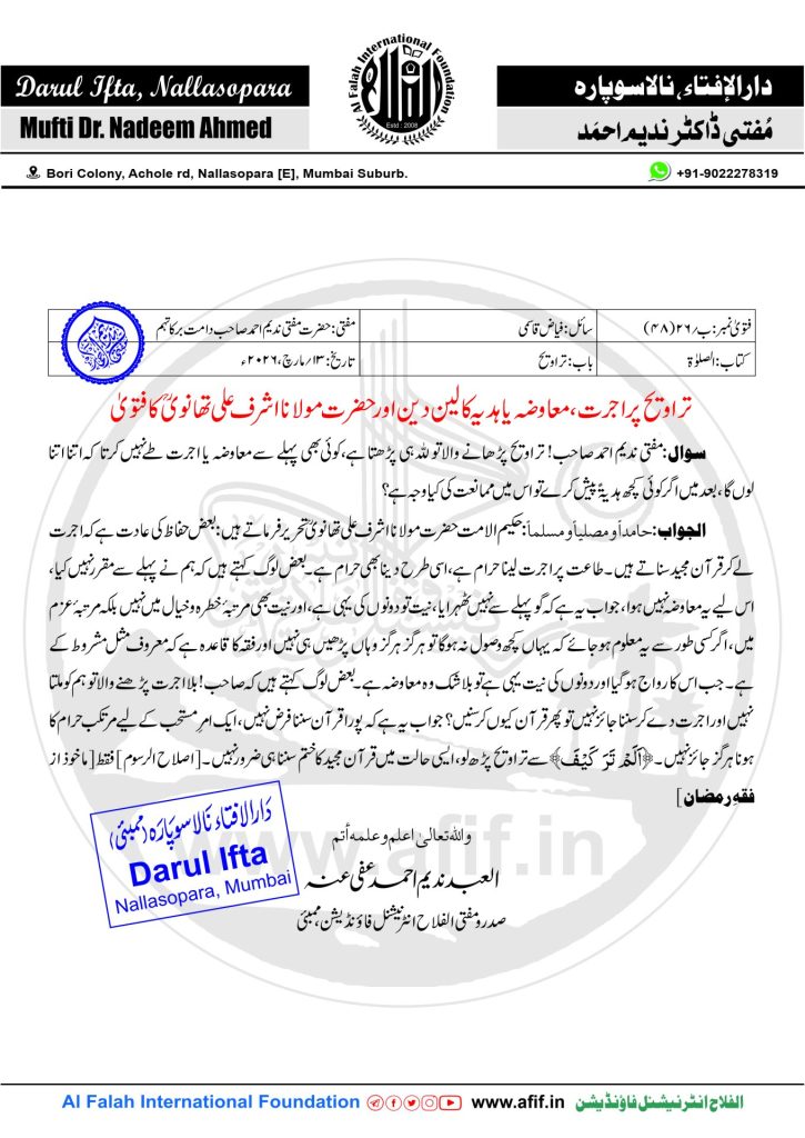 تراویح پر اجرت، معاوضہ یا ہدیہ کا لین دین اور حضرت مولانا اشرف علی تھانویؒ کا فتویٰ