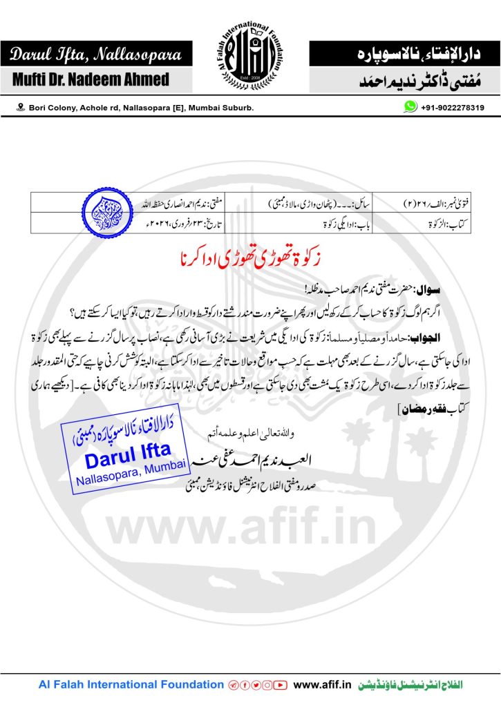 زکوٰۃ تھوڑی تھوڑی ادا کرنا