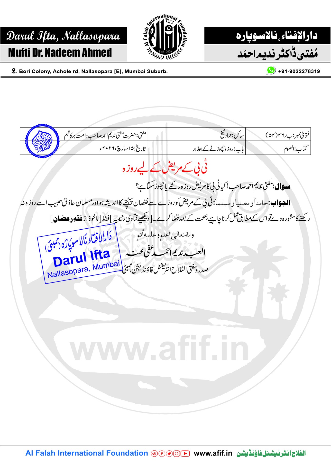 سوال:مفتی ندیم احمد صاحب! کیا ٹی بی کا مریض روزہ رکھے یا چھوڑ سکتا ہے؟