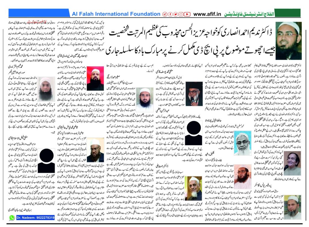 ڈاکٹر مفتی ندیم احمد انصاری -صدر الفلاح انٹرنیشنل فاؤنڈیشن و کالم نگار ممبئی اردو نیوز-کو ممبئی یونیورسٹی نے حال ہی میں پی ایچ ڈی کی ڈگری سے نوازا ہے۔ انھوں نے مشہور قادرالکلام صوفی شاعر اور سوانح نگار خواجہ عزیزالحسن مجذوبؔ پر وقیع تحقیقی مقالہ لکھ کر ۲۰۲۳ء میں ممبئی یونیورسٹی میں جمع کیا تھا۔ خواجہ صاحبؒکے انتقال کے تقریباً اسّی سال بعد پہلی مرتبہ ان کی شخصیت و خدمات کو کسی محقق نے موضوعِ تحقیق بنایا ہے۔ خواجہ صاحب کی شخصیت اہلِ علم و اہلِ ذوق میں غیرمعروف نہیں، حضرت مولانا اشرف علی تھانویؒ کے ممتاز خلفا میں ان کا شمار ہوتا ہے، لیکن ان کی ادبی خدمات کو تقریباً فراموش کر دیا گیا۔ ڈاکٹر ندیم احمد انصاری نے ایسے اچھوتے موضوع پر منفرد اور نمایاں کام کیا ہے۔ واضح رہے کہ یہ ان کی پہلی تحقیقی کاوش نہیں، انھیں تصنیف و تحقیق کا طویل تجربہ ہے، اب تک ان کی چالیس سے زائد کتابیں طبع ہو چکی ہیں۔ اس لیے مشکل موضوع کو بھی انھوں نے سلیقے سے نبھایا ہے۔ ڈاکٹریٹ کی ڈگری ملنے پر سماج کے مختلف طبقات کی طرف سے انھیں مبارک باد پیش کرنے کا سلسلہ جاری ہے۔ بعض نمایاں شخصیات کےاقتباسات پیش ہیں: