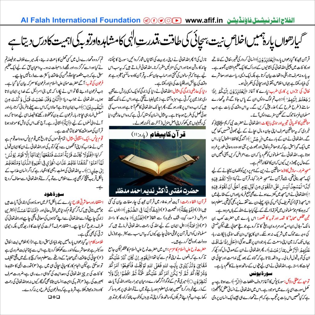 خلاصۂ کلام: یہ گیارھواں پارہ ہمیں چند بنیادی سبق دیتا ہے: (۱)اخلاصِ نیت:نفاق وہ کینسر ہے جو معاشرے کو اندر سے کھوکھلا کر دیتا ہے، اس سے بچنا نہایت ضروری ہے (۲)سچائی کی طاقت: تین صحابہؓکے واقعے سے معلوم ہوا کہ سچ بولنے میں وقتی تکلیف تو ہو سکتی ہے لیکن انجام کار کامیابی سچائی ہی میں ہے (۳)قدرتِ الٰہی کا مشاہدہ: کائنات کی ہر چیز اللہ تعالیٰ کی وحدانیت کی گواہی دے رہی ہے، ضرورت صرف بصیرت کی ہے (۴)توبہ کی اہمیت:انسان جتنا بھی گنہ گار کیوں نہ ہو اللہ تعالیٰ کی رحمت کا دروازہ ہمیشہ کھلا ہے، شرط یہ ہے کہ وہ فرعون کی طرح دیر نہ کر دے۔