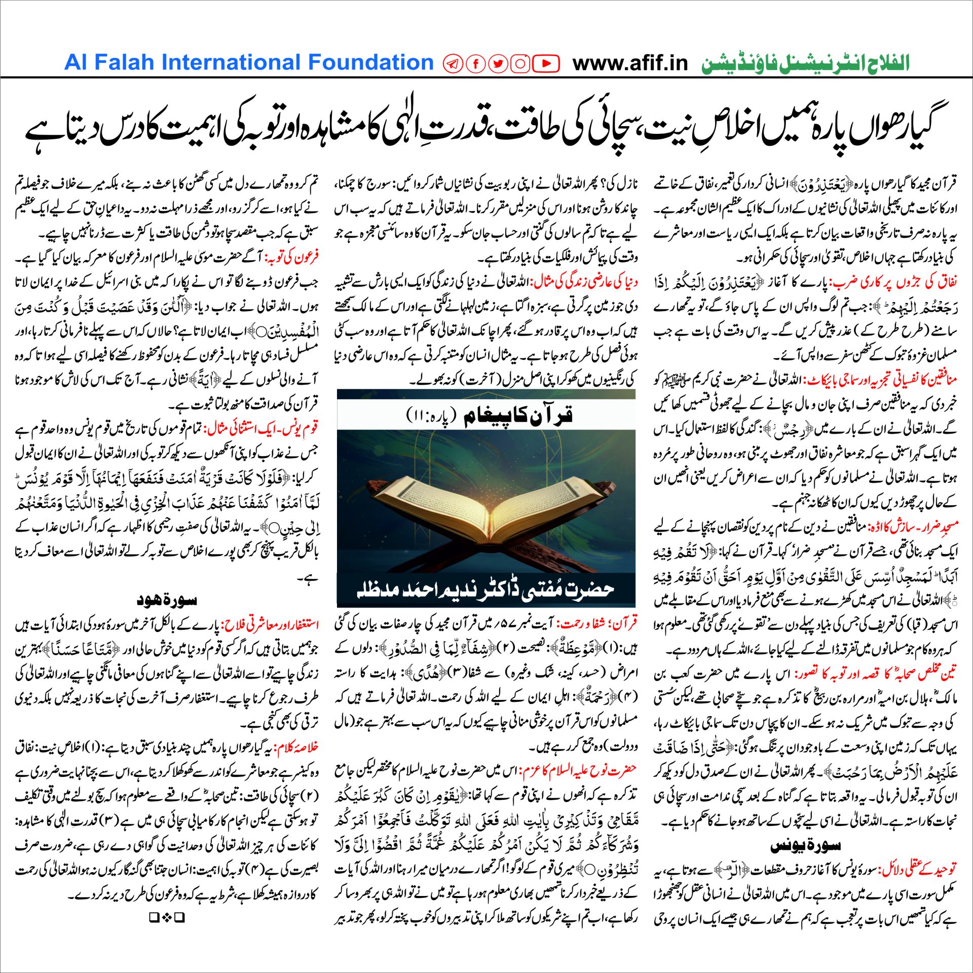 قرآن مجید کا گیارھواں پارہ ﴿يَعْتَذِرُوْنَ﴾ انسانی کردار کی تعمیر، نفاق کے خاتمے اور کائنات میں پھیلی اللہ تعالیٰ کی نشانیوں کے ادراک کا ایک عظیم الشان مجموعہ ہے۔ یہ پارہ نہ صرف تاریخی واقعات بیان کرتا ہے بلکہ ایک ایسی ریاست اور معاشرے کی بنیاد رکھتا ہے جہاں اخلاص، تقویٰ اور سچائی کی حکمرانی ہو۔