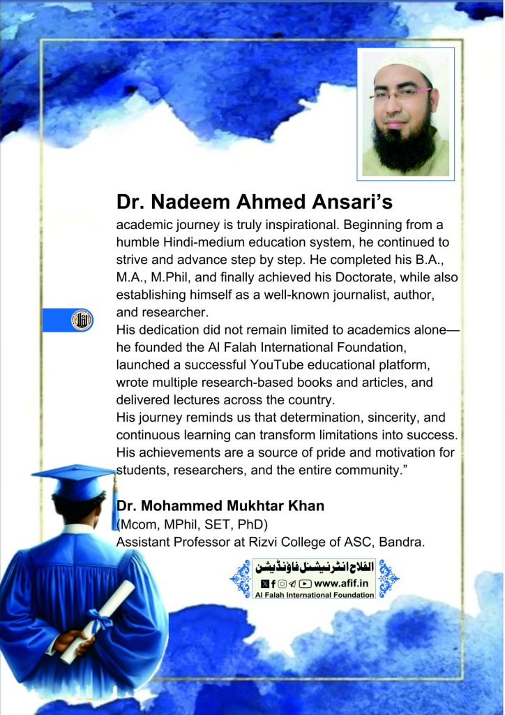 His dedication did not remain limited to academics alone—he founded the Al Falah International Foundation, launched a successful YouTube educational platform, wrote multiple research-based books and articles, and delivered lectures across the country.